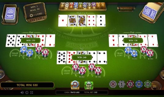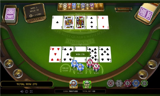 市面上有很多版本的绿洲扑克。由于我没玩过,所以无法透露它们遵循哪些规则,但我可以说它们允许换一到五张牌,但需要付费。他们没有透露具体价格。不过,一个常见的版本要求换一张或五张牌的费用是底注的1倍,换两张或四张牌的费用是底注的2倍,换三张牌的费用是底注的3倍。如果是这样,假设赔率表是1-2-3-4-5-7-20-50-100,那么在最佳策略下,赌场优势是1.04%。产品说明书声称回报率为99.7%,但我不知道他们从哪里得到这个数字,对此我有点怀疑。