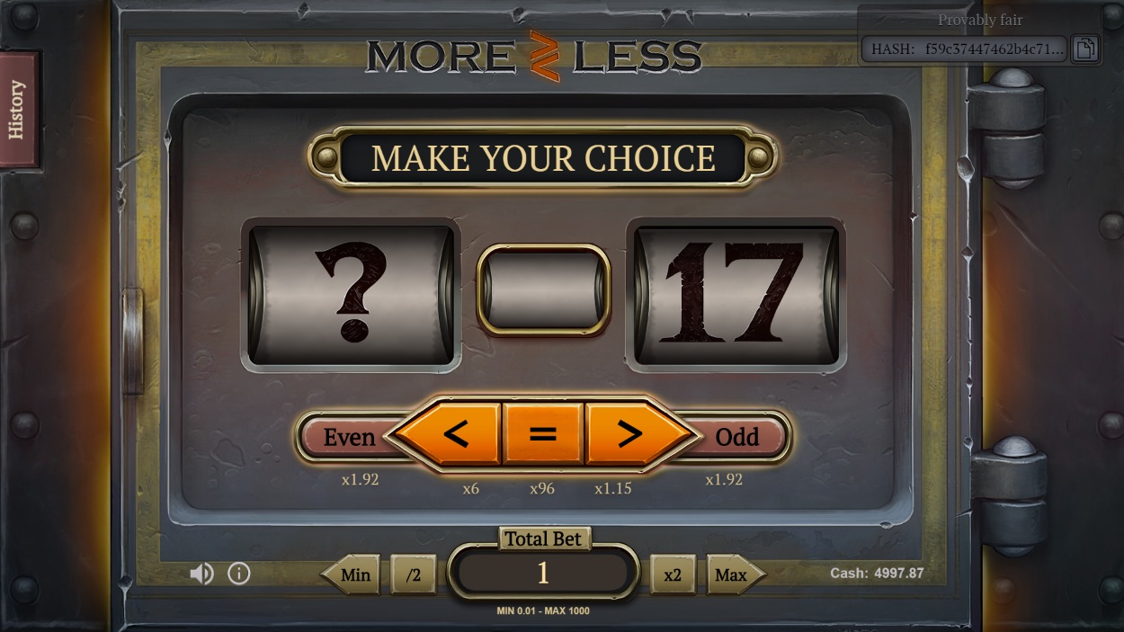 MoreLess 是一款简单的游戏,玩家需要预测 1 到 100 之间的一个随机数是小于、等于还是大于之前选择的数字。赔率与获胜概率成正比。所有规则和分析,请参阅我的MoreLess页面。