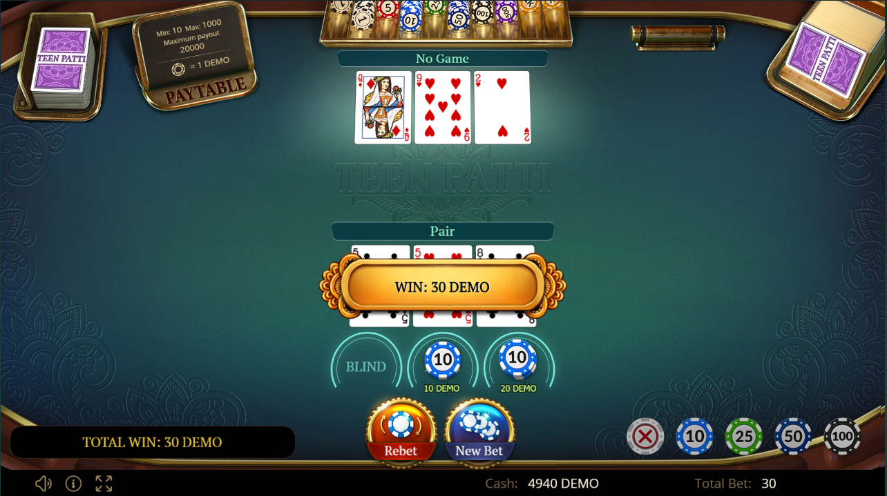 Teen Patti 的结构和三张牌扑克类似,但规则在很多方面有所不同。帮助文件对规则的解释不太清楚,所以恐怕我得等弄清楚规则之后再分析。