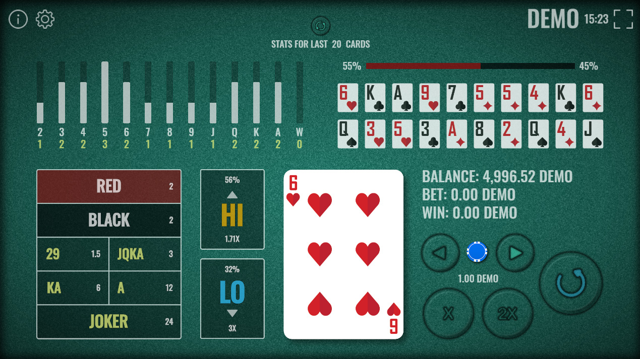 Hi Lo是一款简单的纸牌游戏,基于预测一副牌中下一张牌的牌型。不同软件提供商的规则有所不同。以下是 Expanse Studios 的规则。