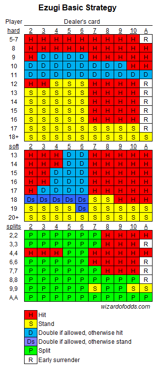 由于A牌的提前投降规则(玩家的赔率为0.39%),赌场优势非常低,仅为0.11%。帮助文件错误地将回报率定为99.50%。基本策略如下: