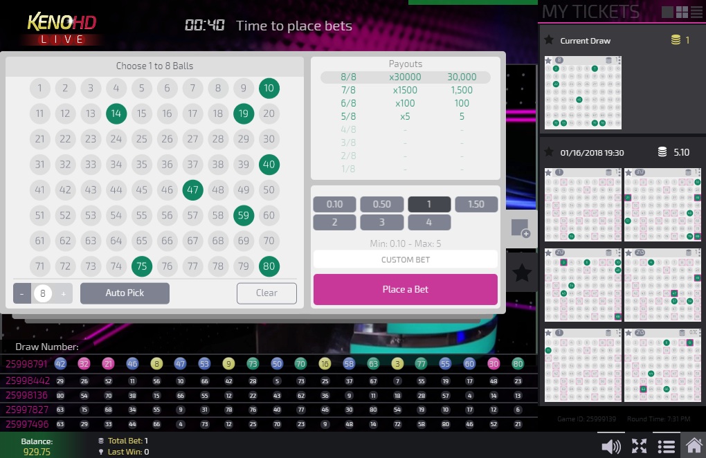 号码投注是一种彩票游戏,玩家可以通过多种方式投注从49个球中抽取6个球。真人荷官每五分钟开奖一次。有关所有规则和赔率,请访问我的“号码投注”页面。