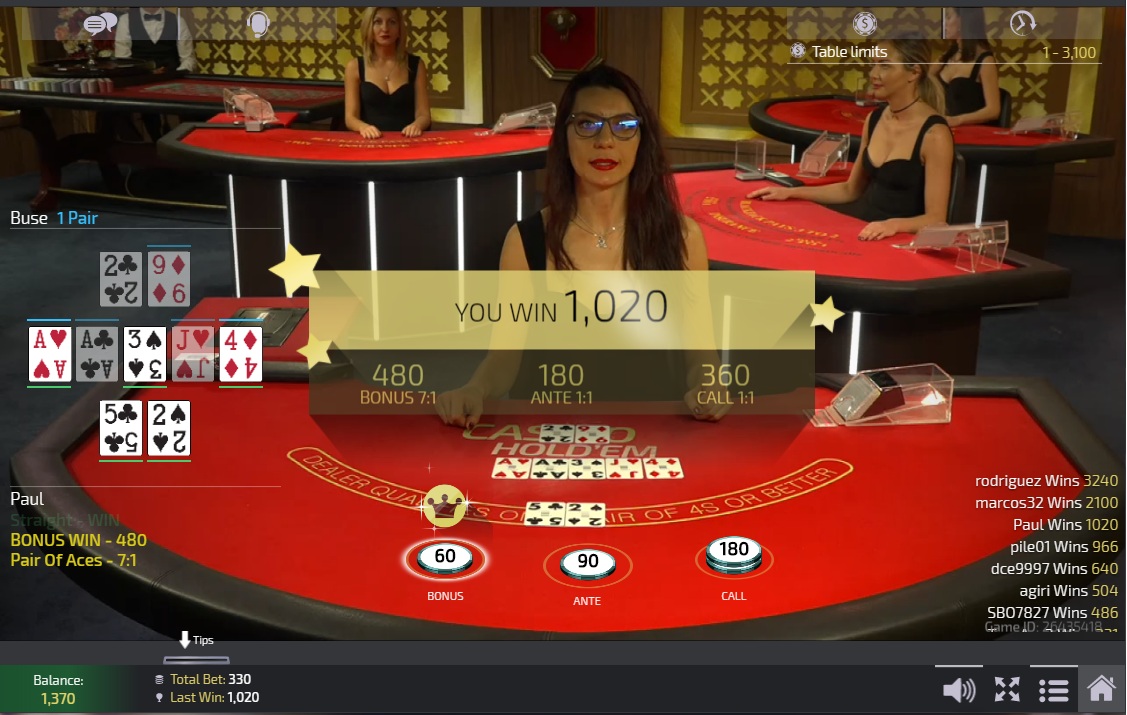 赌场德州扑克遵循常规规则。底注 (Ante) 的赔率遵循 100-20-10-3-2-1,赌场优势为 2.16%。红利注 (Bonus Bet) 的赔率遵循 100-50-40-30-7-7-7-7,赌场优势为 6.26%。