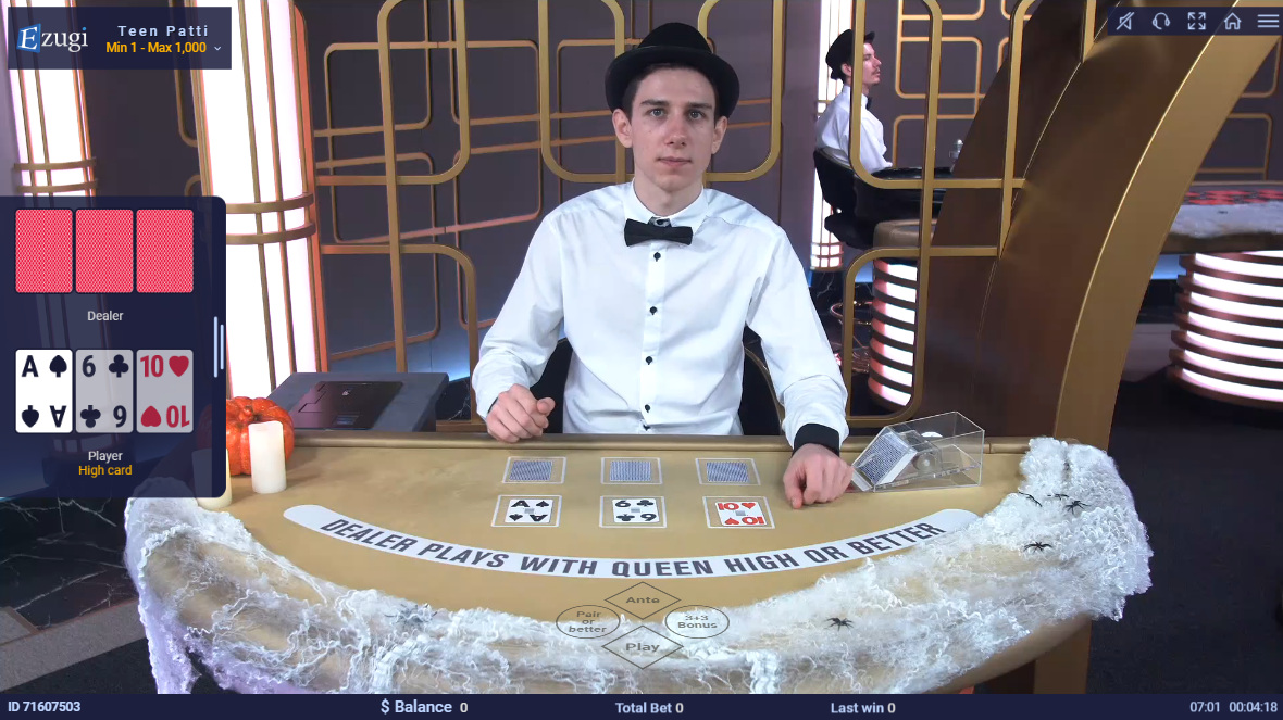 Teen Patti 通常指一种在印度流行的扑克游戏。然而,Ezugi 将这个名字应用于三张牌扑克。他们遵循 1-4-5 底注红利的赔付表,庄家优势为 3.37%。