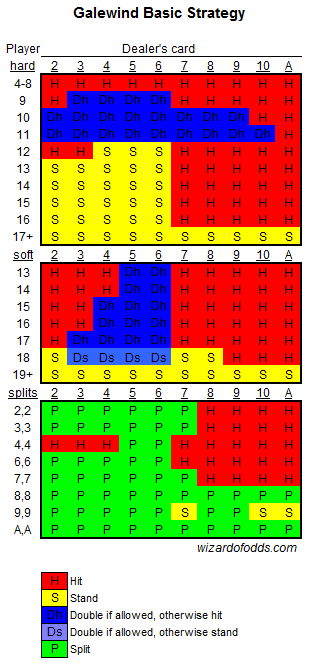 以下是这些规则的正确基本策略。一些明显的玩法被省略了,例如永远不要拆分五张或十张,以及永远不要购买保险。
