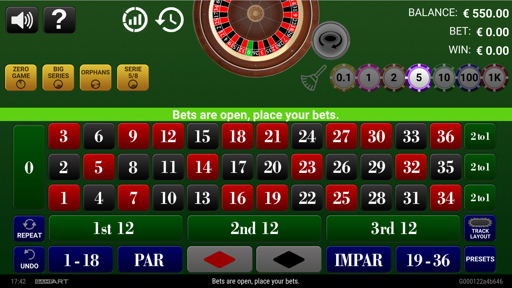 轮盘赌游戏相当标准。轮盘上只有一个零,每次下注的赌场优势为 2.70%。