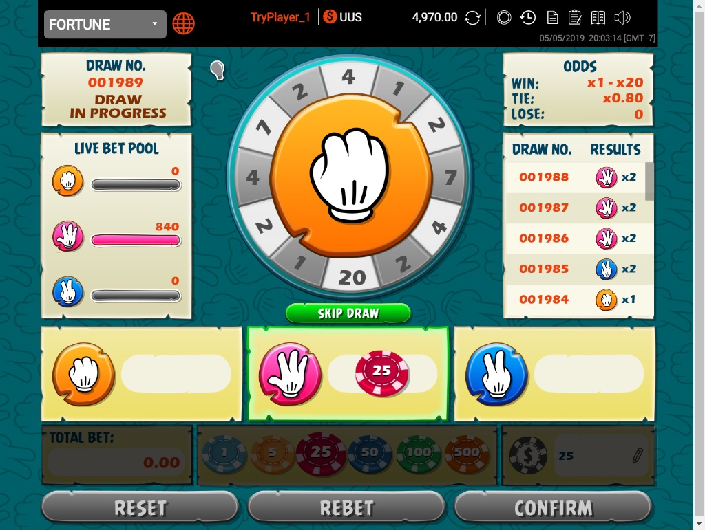 石头剪刀布有两种版本。经典版和超级版遵循传统规则,但平局赔率为 0.9 比 1。幸运版和财富版使用轮盘来决定胜负,平局赔率为 0.8 比 1。不要被轮盘上那些大数字所诱惑。105 场游戏的样本显示,平均胜率仅为 1.92,总回报率为 90.79%。