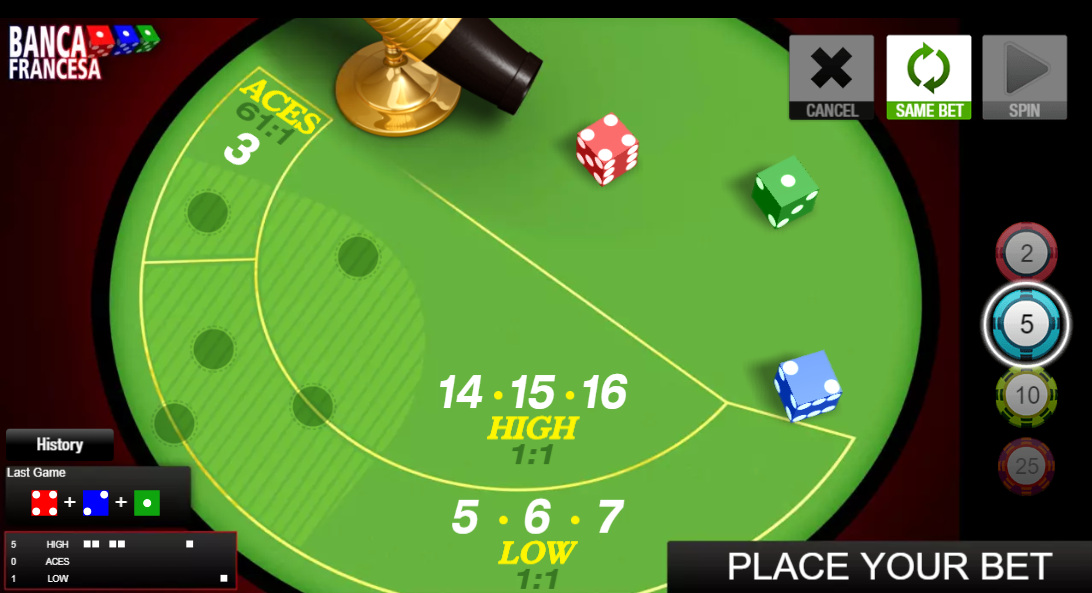 弗朗西斯银行(Banca Francesa)是一款葡萄牙骰子游戏。它可以简单地理解为骰宝的简化版本。游戏只有三种投注方式,如果投注结果为平局,则每种投注的庄家优势仅为0.46%,如果结果为平局(平局现象很普遍),则庄家优势为1.59%。完整规则和分析,请参阅我的弗朗西斯银行页面。