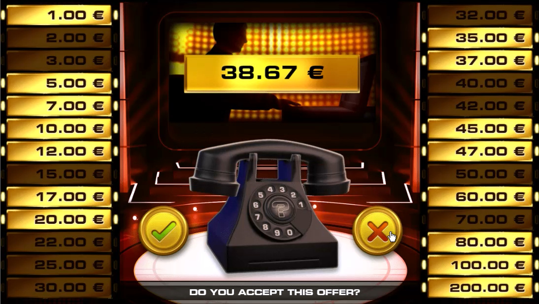 一掷千金轮盘赌(Deal or No Deal Roulette)在一个38槽的轮盘上进行,每个数字从0到37,再加上一个标有“奖金”(Bonus)的数字。如果玩家在轮盘的奖金区域下注,并且球停在奖金区域,那么他将进入一轮一掷千金奖金轮。轮盘上还有一个随机旋转的指针。除了投注奖金之外,它没有任何用途。如果玩家在奖金区域下注,球停在奖金区域,并且指针指向轮盘上的奖金槽,那么玩家将进入超级奖金轮盘。这种情况每1,444次旋转会出现一次,所以如果我不明白这是什么意思,请原谅我。