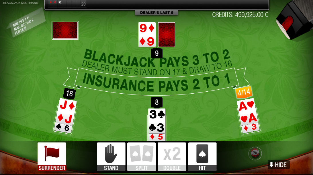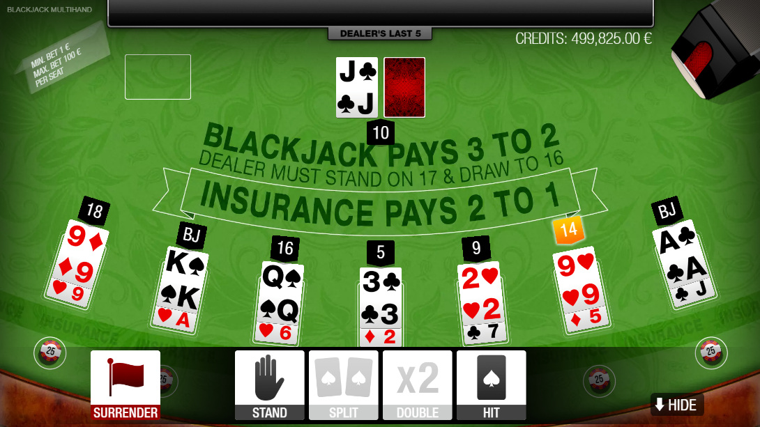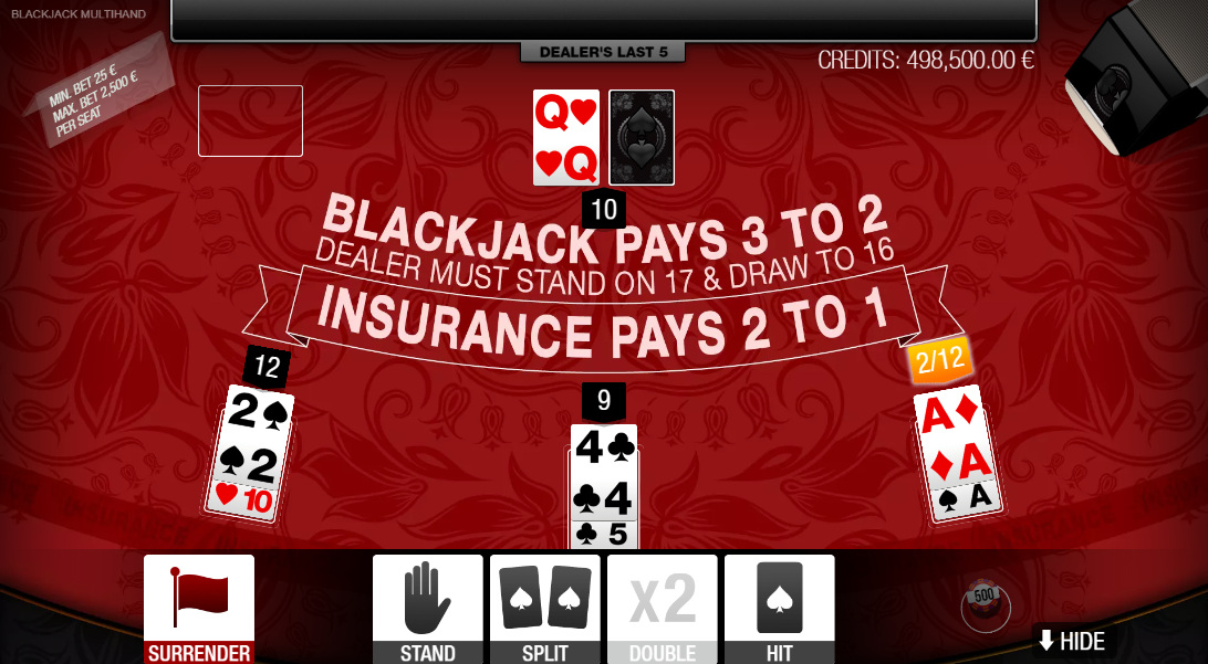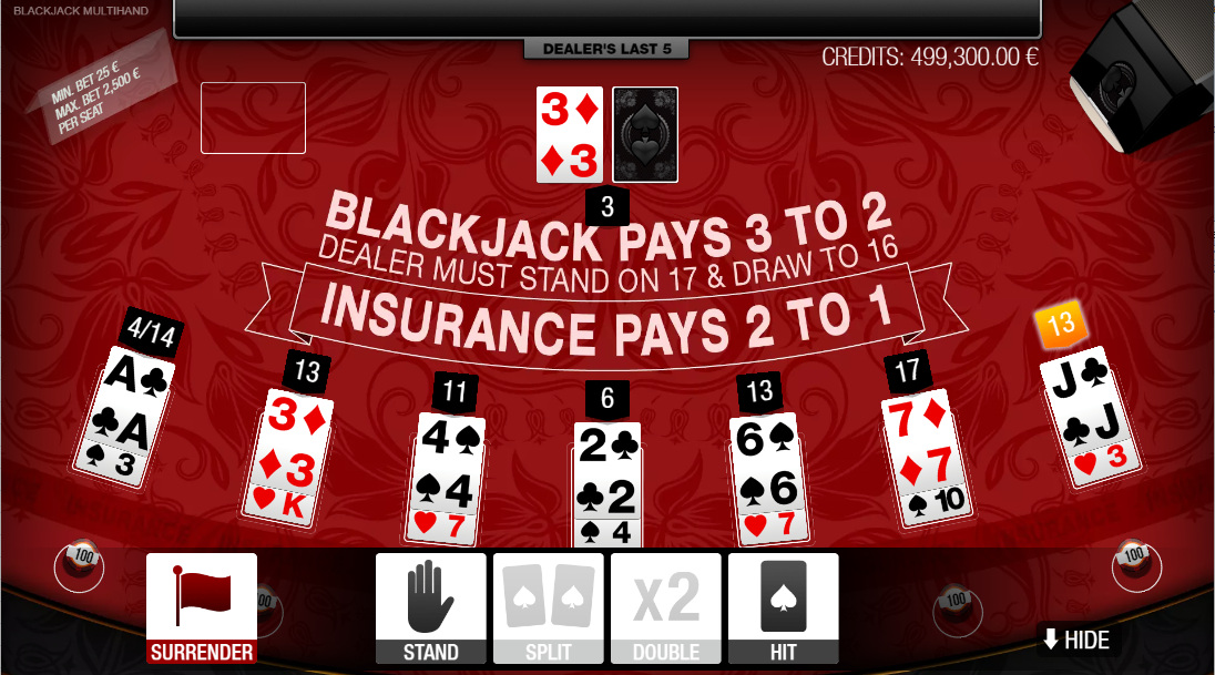规则是典型的在线二十一点:6副牌,庄家在软17点停牌,庄家偷看黑杰克,仅在9到11点时加倍,分牌后允许加倍,允许投降,每手初始牌只分一次。根据我的二十一点庄家优势计算器,这些规则下的庄家优势为0.44%。