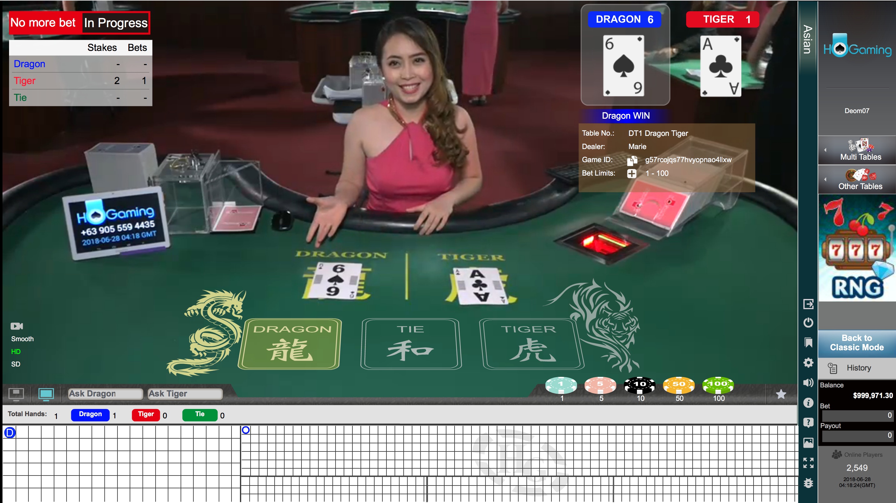 龙虎游戏非常简单,龙和虎牌各得一张牌,玩家拿到的牌越大越好。此外,还有平局投注。如果平局,龙虎投注输一半,赌场优势为3.73%。HoGaming网站没有说明平局的赔率,但在其他真人荷官游戏中,赔率通常为8比1,赌场优势为32.77%(哎哟!)。