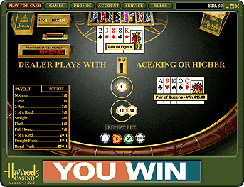 Kismet 软件提供独一无二的扑克老虎机游戏,这是其他任何赌场都无法比拟的。它融合了三张牌扑克和三卷轴老虎机的玩法。游戏的赔率基于扑克组合,包括一对、同花、顺子、三条、同花顺、皇家同花顺,以及三张方块 Q 的累积奖金。投注额从 20 便士(约 35 美分)到 3 英镑(约 5.40 美元)不等。游戏节奏很快,对于想要体验扑克乐趣的老虎机玩家来说,绝对精彩纷呈。