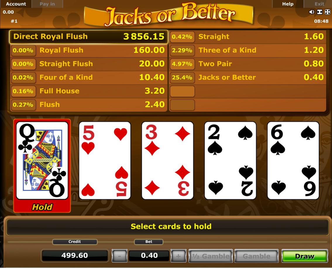 - 非常规赔付表:我不明白为什么网络赌场的视频扑克赔付表总是那么奇怪。比如这张牌,四张牌中有三个的皇家点数赔付400。常规的800有什么问题吗?
