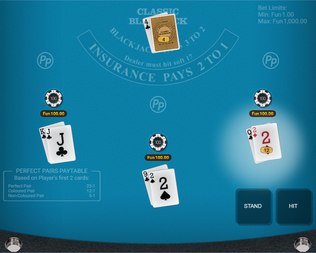 完美对子游戏提供完美对子边注,使用 5-12-25 赔付表。