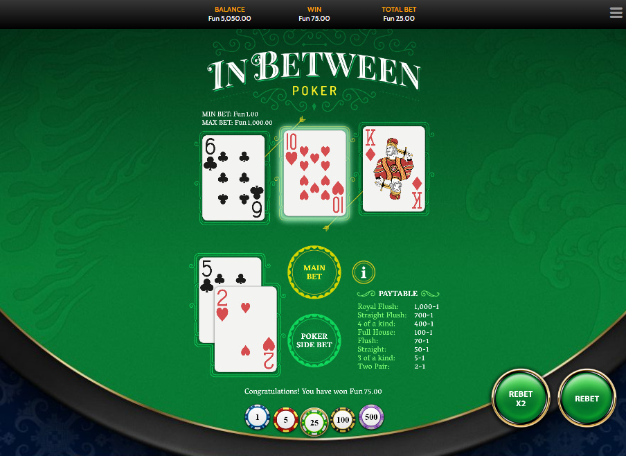据我所知, “In Between”是 OneTouch 的一款独特游戏。游戏将三张牌连成一线,如果中间的牌位于点数相同的左右两张牌之间,则获胜。此外,还有一种两张牌的牌型可供选择。请点击链接了解更多信息。