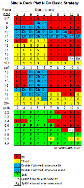 根据这些规则,赌场优势为 1.26%。既然他们的标准游戏赌场优势只有 0.46%,那么玩这个游戏就没什么意义了。不过,如果您一定要玩,请点击下方图片,查看这些规则下基本策略的放大版本。请注意,由于规则非常规,所以这也是一种非常规策略。