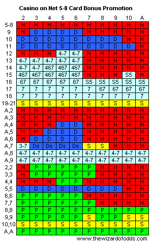 Casino on Net 也曾两次推出促销活动,任何五张或以上且未爆牌的手牌均可获得奖金。五张牌的奖金为赌注的一半,六张牌的奖金等同于赌注,七张牌的奖金等同于赌注的五倍,八张牌的奖金等同于赌注的五十倍。Casino on Net 的工作人员告诉我,该规则也适用于分牌后的手牌。遗憾的是,对于本次促销活动,软件会在软21点时自动停牌。如果玩家制定了专为本次促销活动设计的完美组合策略,他将获得0.55%的优势。