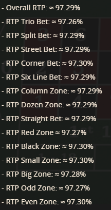 奇怪的是,帮助文件列出的每种投注的回报率略有不同。例如,黑色的回报率为 97.30%,而红色的回报率为 97.27%。