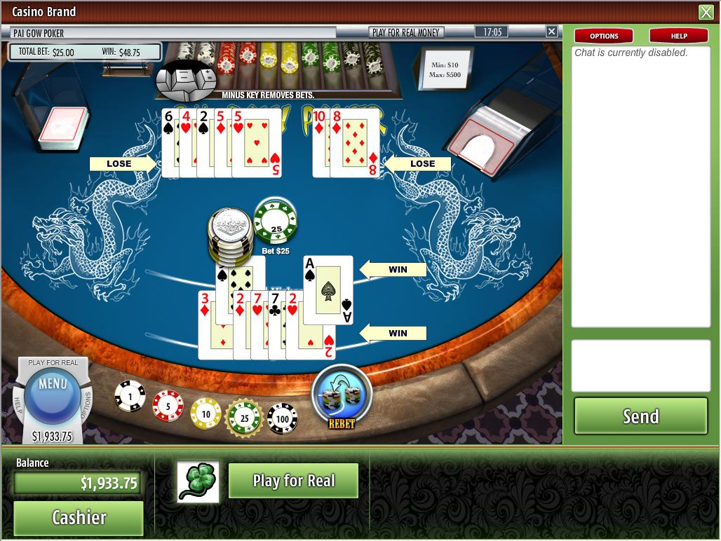 牌九扑克遵循标准规则。为了方便起见,它有一个“庄家方式”按钮。玩家无法破坏自己的牌局,因为游戏不允许玩家选择比高牌更好的低牌。与在线牌九扑克一样,庄家始终是庄家。假设玩家玩“庄家方式”,赌场优势为 2.72%。在最佳策略下,赌场优势为 2.51%。
