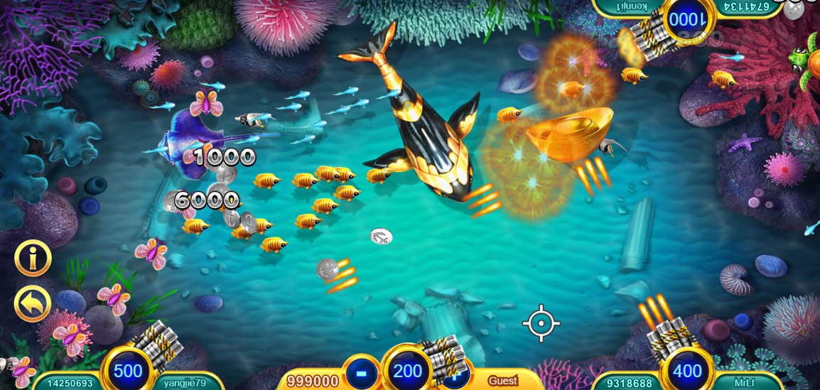 公司网站上列出了四款不同的街机游戏,但我在一个“免费游戏”网站“Fu Fish”上只找到了其中一款。不得不说,据我所知,这款游戏做得非常出色,而且独一无二。游戏的目标很简单,就是射鱼。每射出一颗子弹都是一场赌注。瞄准哪里似乎没什么区别,有时能射中鱼,有时却射不中。不同的鱼赢得的金额也不同。我怀疑这款游戏实际上并不需要技巧,因为帮助界面上贴心地告诉你玩家回报率是97.00%。