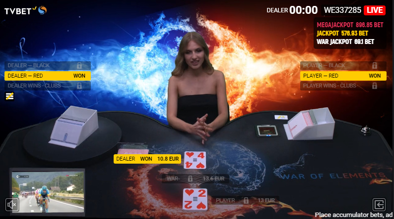 元素战争是赌场战争的升级版。游戏使用一副牌。玩家可以押注获胜方,也可以进行各种附加投注。赔率会随着荷官的发牌而动态更新。它看起来与赌注战争非常相似。