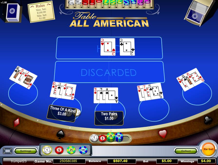 这是视频扑克游戏All American的桌面游戏版本。玩家可以玩 1 到 5 个投注点。Vista 的赔率表与视频扑克游戏相同,但皇家同花顺的赔率是 250,而不是 800。这使得赌场优势从 96.27% 降至 95.12%。