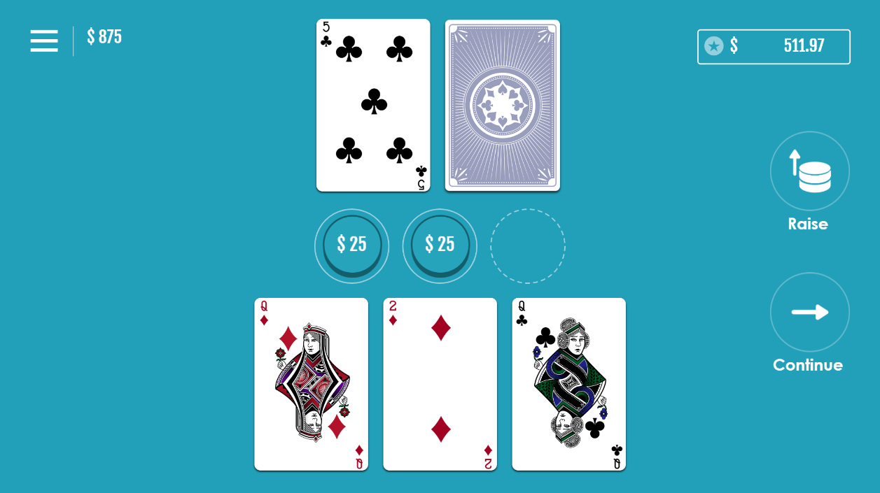 Teen Patti Pro 类似于三张牌扑克,但只允许边注。玩家可以押注赢家、平局或任意一手牌的牌值。完整规则和分析,请参阅我的Teen Patti Pro页面。