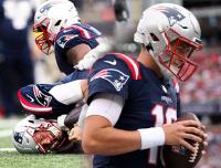 新英格兰爱国者队四分卫麦克·琼斯在对阵巴尔的摩乌鸦队的比赛中脚踝受伤